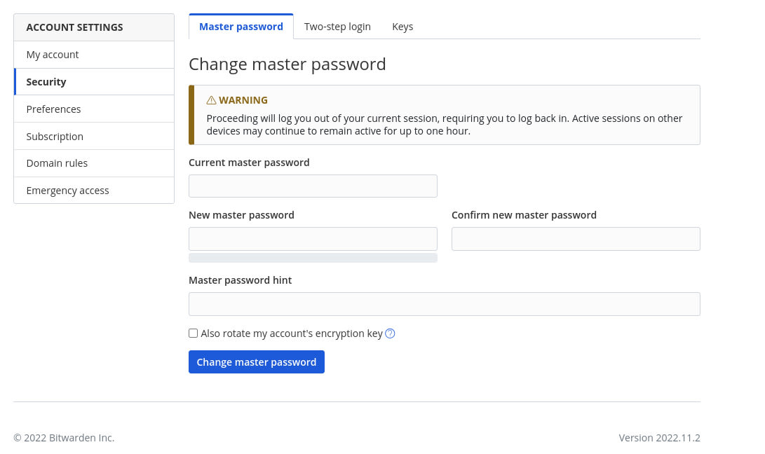 Important Note: Changing your master password is an encrypted operation that will change the encryption of your vault. You will want to make a backup of your vault first, just in case something unexpected happens. The download of this file should be handled with extreme care as it contains all of your vault information. Some users like to download it onto a USB key and store it in a safe and secure place.