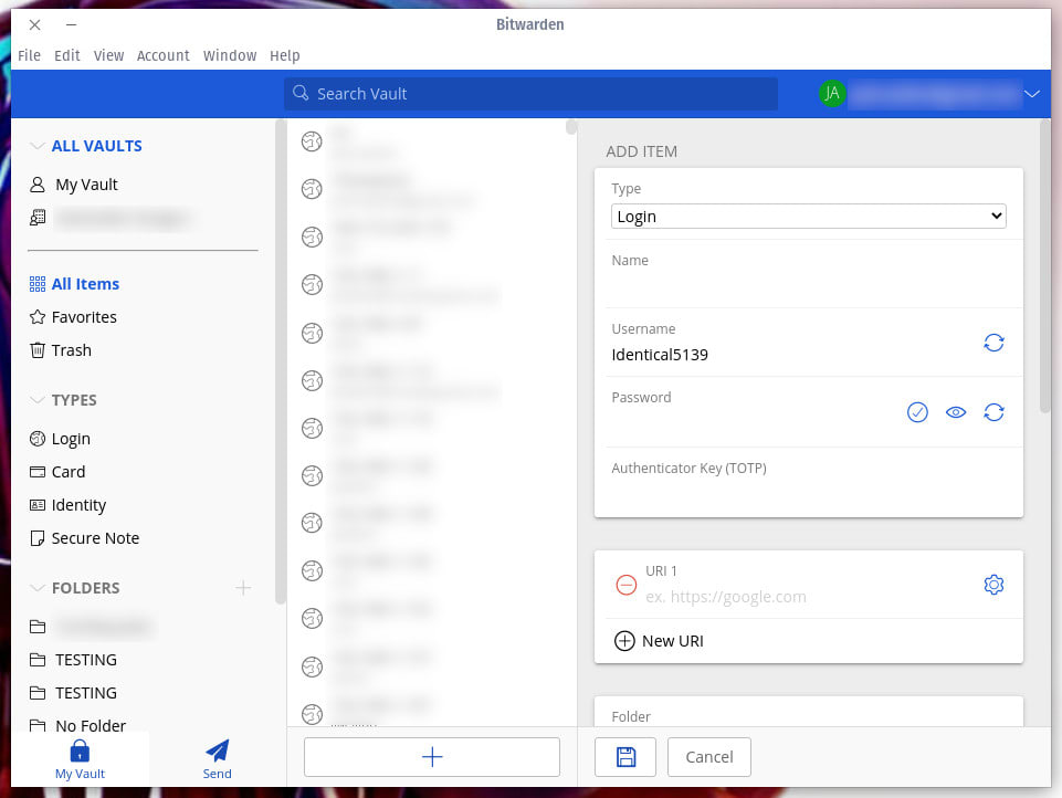 Figure A: Creating a new Item in Bitwarden on the desktop client
