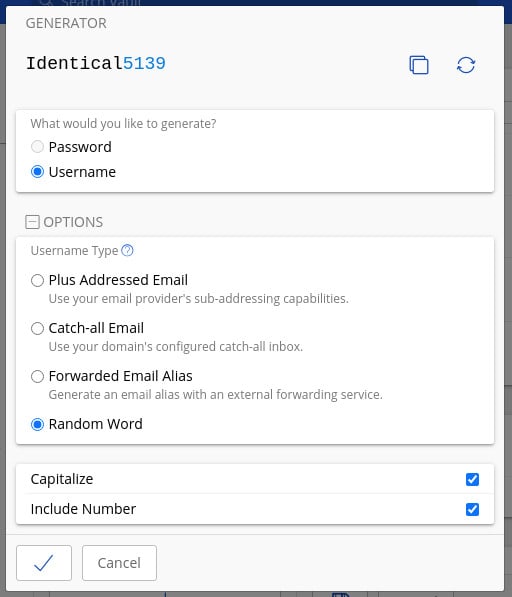Most likely, you'll just want to go with the default Random Word generator, and click the check to accept the username presented. If you don't like the username, click the circle/arrows icon again and Bitwarden will generate another random username. Once you're happy with the username, click the check and the random name will populate the username field (Figure D).