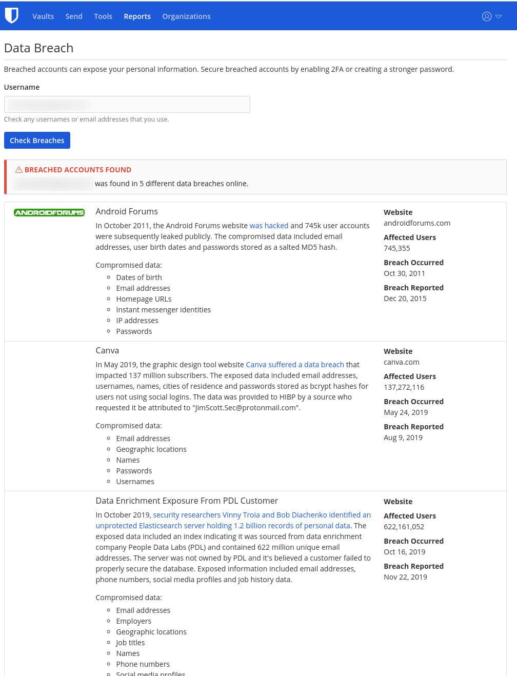 Thankfully, Bitwarden has a handy tool to help keep you up to date with data breaches. Said tool is the Data Breach report and is available for individual vaults across all plans, including free. The Data Breach report tool identifies compromised data (such as email addresses, passwords, credit cards, dates of birth, and more). The Data Breach report uses a very popular (and widely accepted) service, called Have I Been Pwned to display any information regarding data breaches that involve any of your accounts.