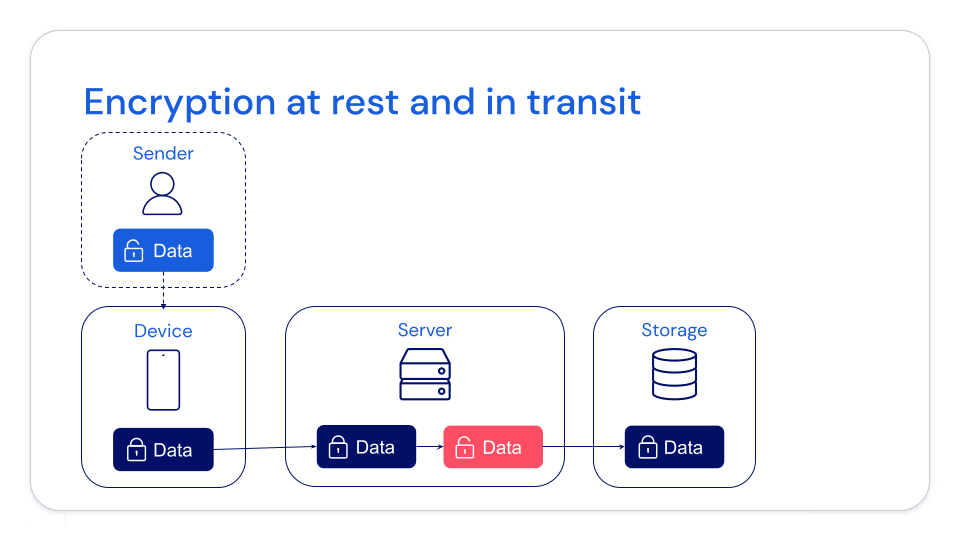 In the example below, the data is only encrypted when it moves from the sender’s device to the server — leaving the server-side data unprotected from potential attacks.