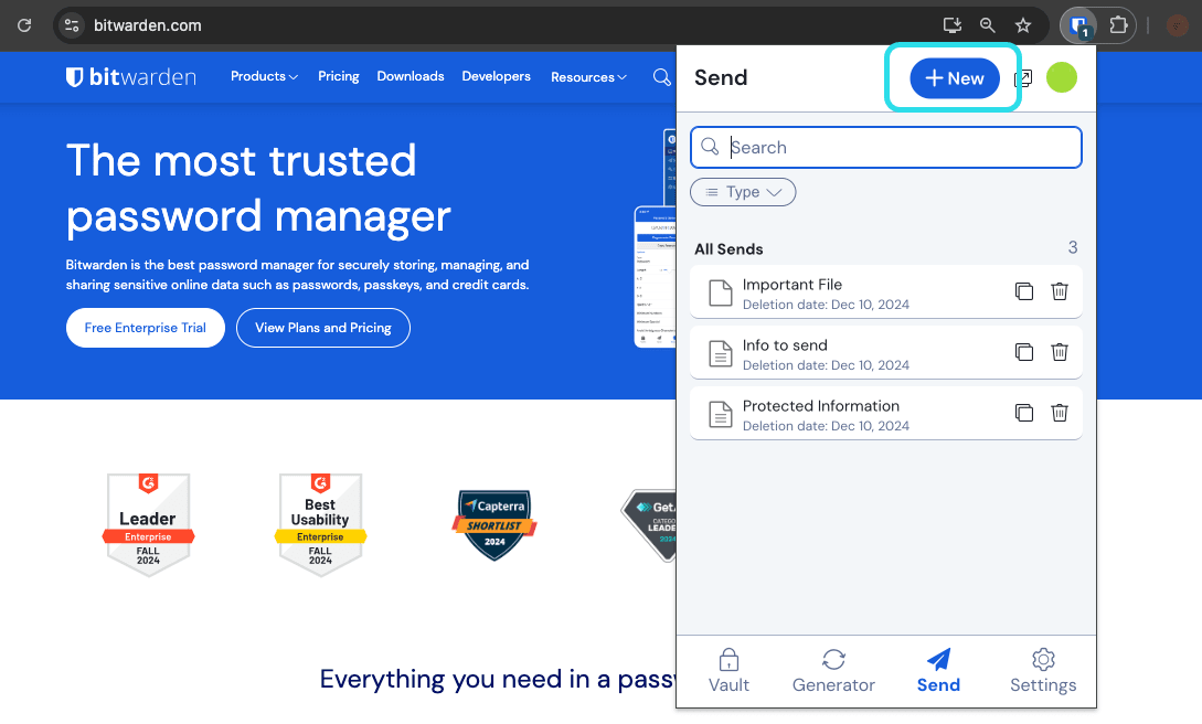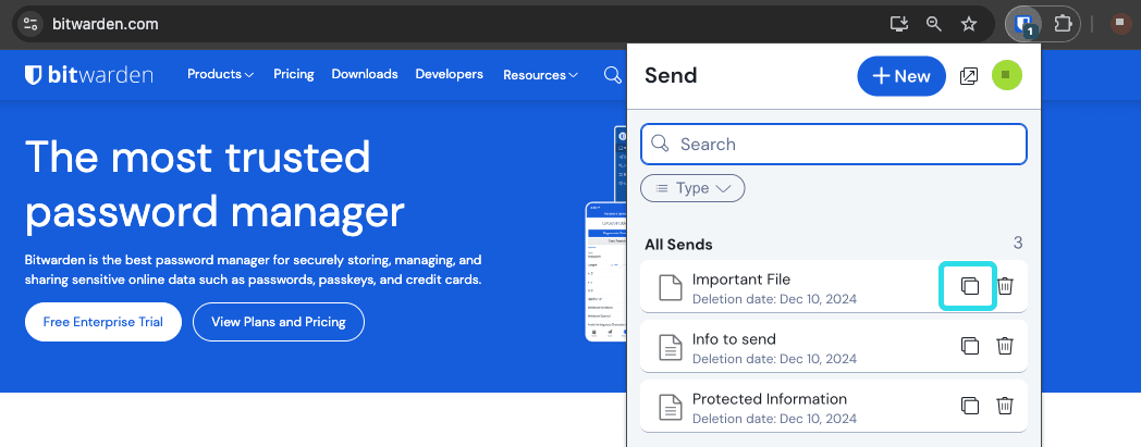Anyone can create text Sends, but file Sends can only be created by premium users or members of a paid organization (families, teams, or enterprise). Choose the Bitwarden app you want to Send from to get started: