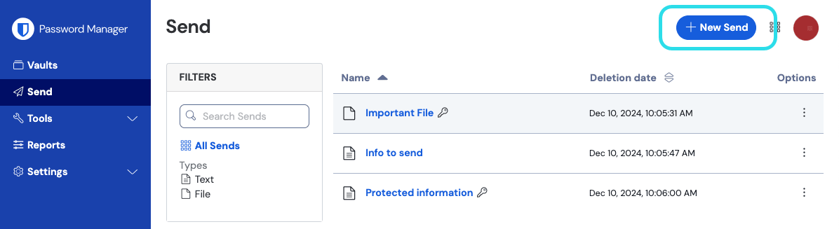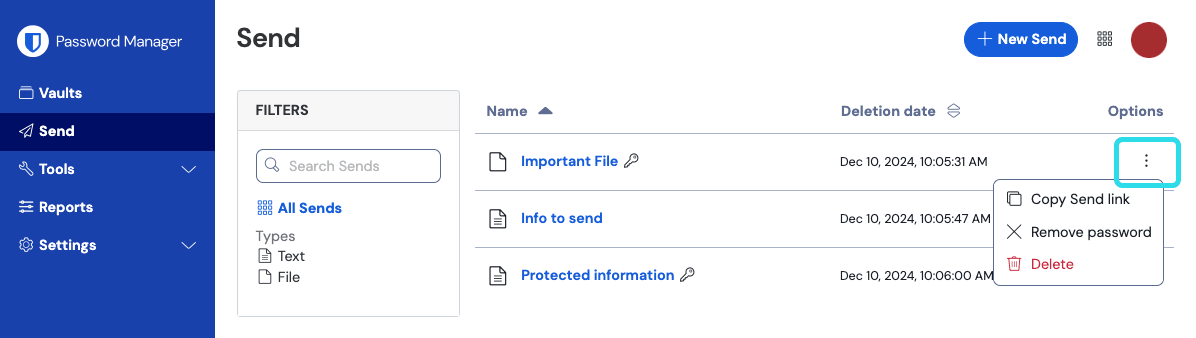 This view will list Sends that have not reached their deletion date. Like the Vaults view, you can filter your Sends by selecting one of the available Types.