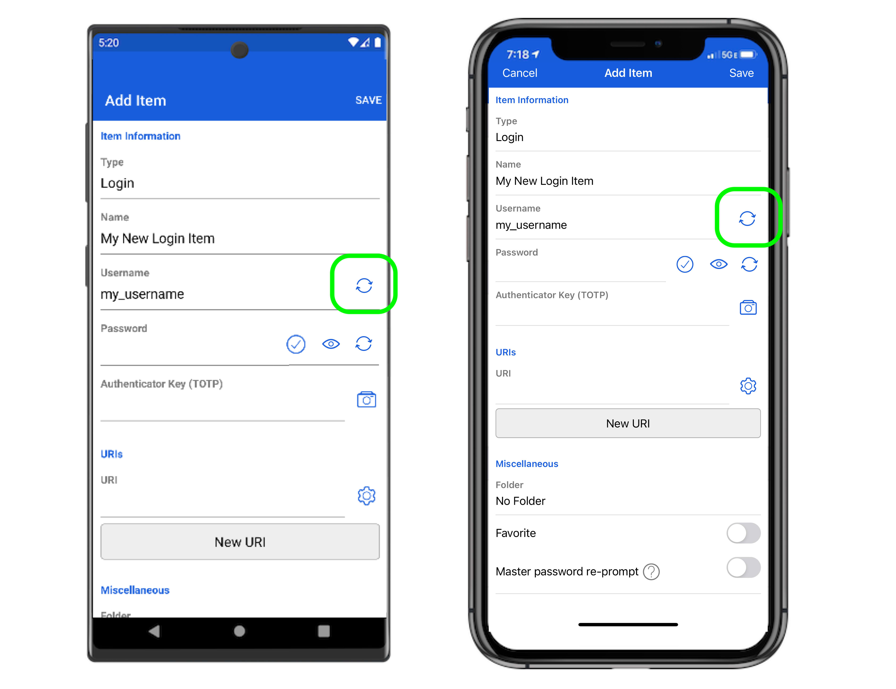 You can also generate a username from the Add/Edit item screen, as well as from the iOS app extension accessible by tapping the Share icon, using the Generate button: