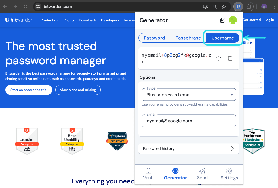 Use the Bitwarden generator tool to easily create strong passwords and unique usernames. The password generator is available in all Bitwarden apps and the username generator is available in the web vault, browser extension, desktop app, and mobile app.