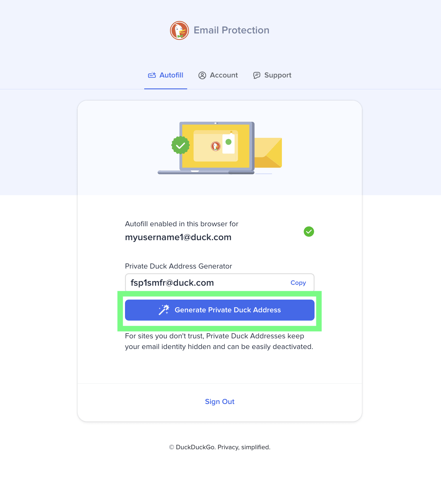 Select Regenerate Username to generate a username and automatically create the corresponding alias in DuckDuckGo.