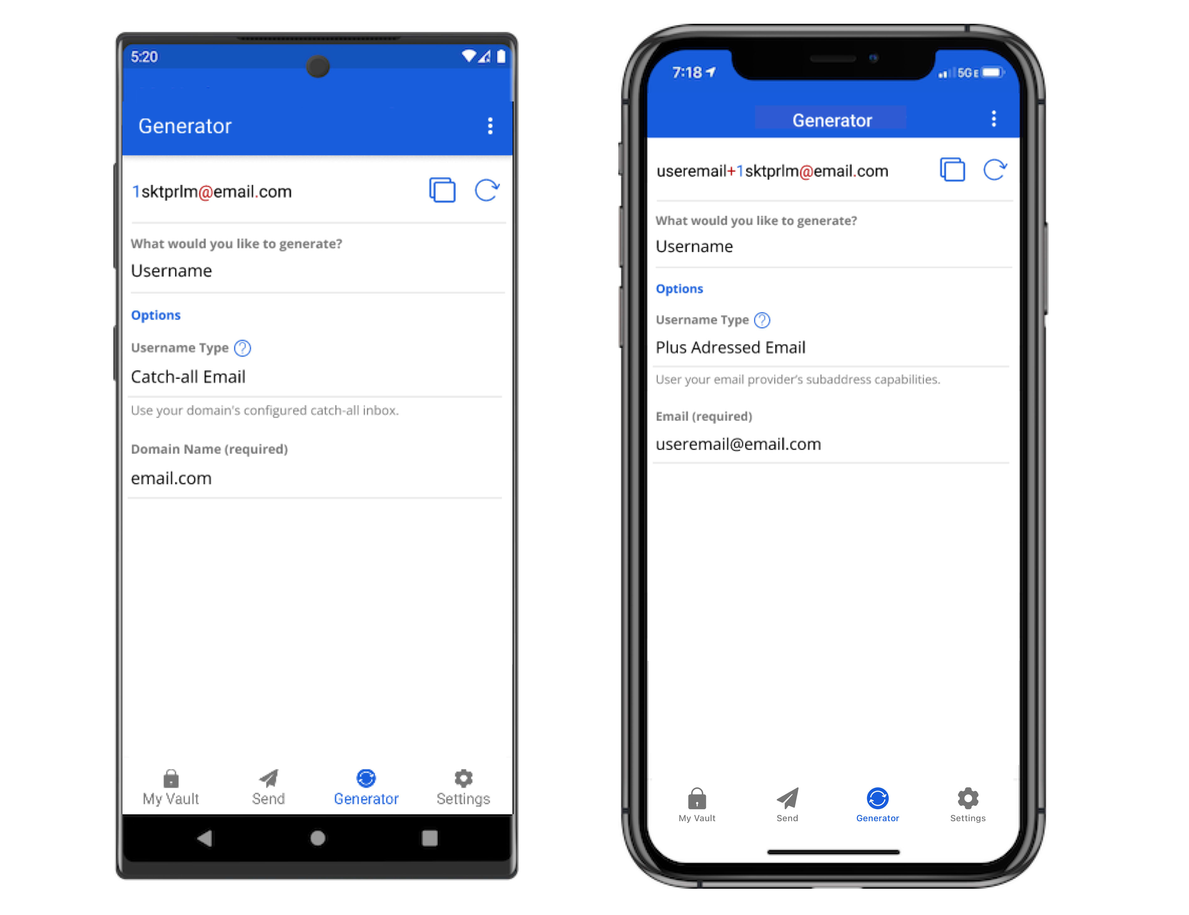 On the Add/Edit Item screen of browser extensions and desktop apps, you can select between generating username with a Random (for example, alice+gsd4aqqe@bitwarden.com) string or one based on the item's email address (for example, alice+github.com@bitwarden.com). Email address is limited to browser and desktop as it requires knowledge of the login's URI, in other locations the username generator will default to Random.