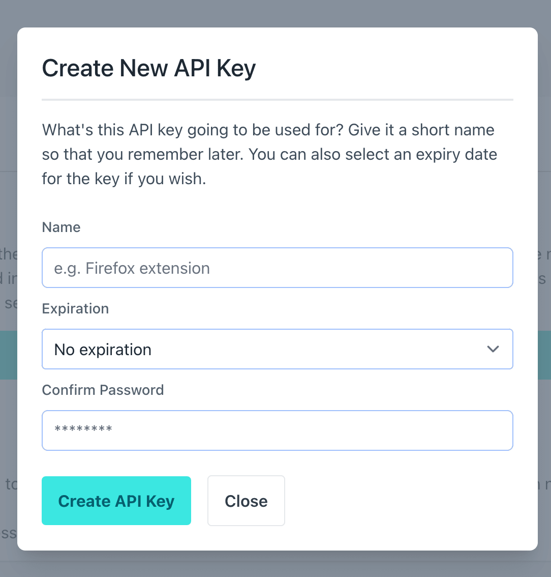 In the Create New API Key dialog, enter a Name that indicates the new token will be used by Bitwarden, an Expiration, and Confirm your Addy.io account password. Once you have completed the required fields, select Create API Key.