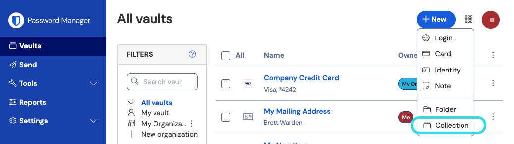 In a lot of ways, collections are like the folders you might use to organize your individual vault. A key difference is that items that belong to your organization must be included in at least one collection.
