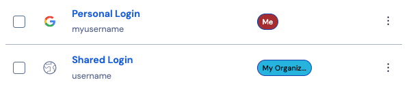 You might not have a item shared from an organization yet, but when you do it will be displayed in your vault with a card indicating where the item is from: