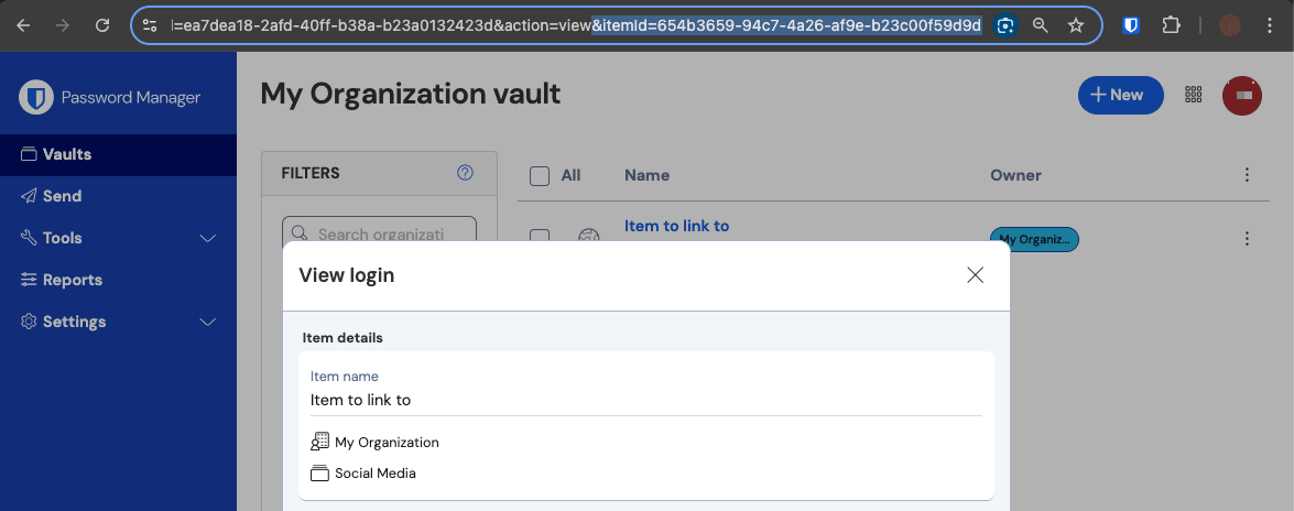 When you need to direct members of your organization to a specific vault item, for example in documentation, you can copy the URL of an item to be used as a direct link for users that have access to the item.