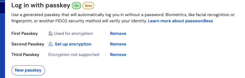Your passkeys list will show whether each passkey is used for encryption, supported but not enabled, or not supported:
