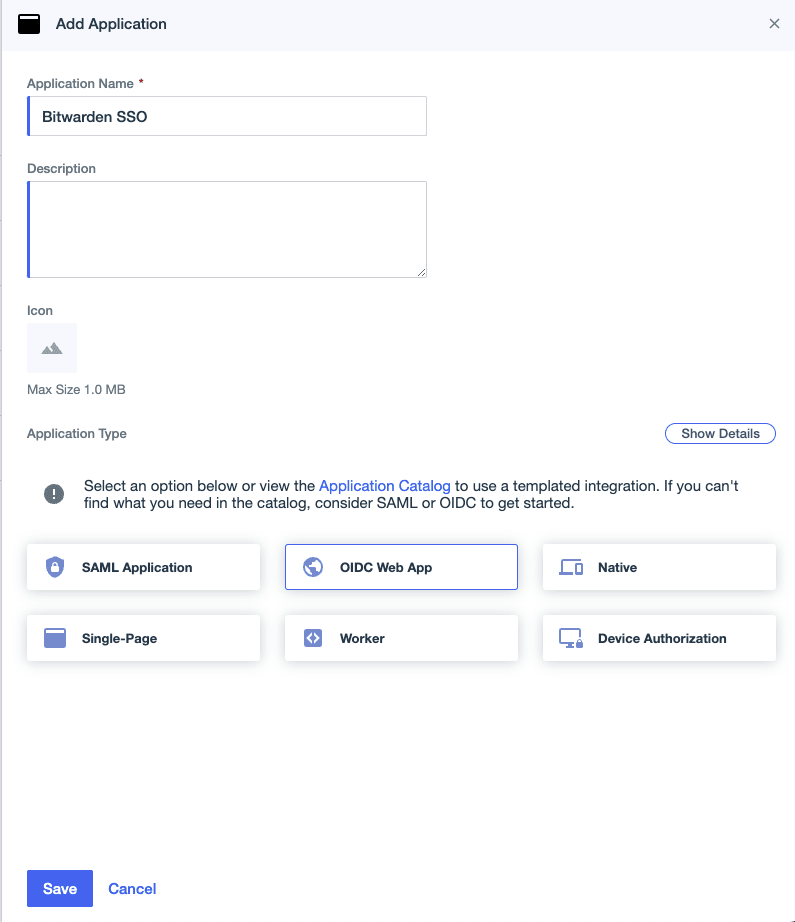 Enter a Bitwarden Specific name in the Application Name field. Optionally, add desired description details as needed.