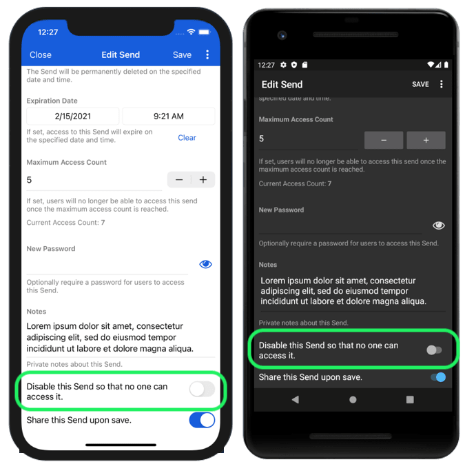 To disable a Send from a mobile app, open the Edit Send view and toggle the Disable this Send so that no one can access it option. You can toggle this option off at any time to re-enable access to the Send.